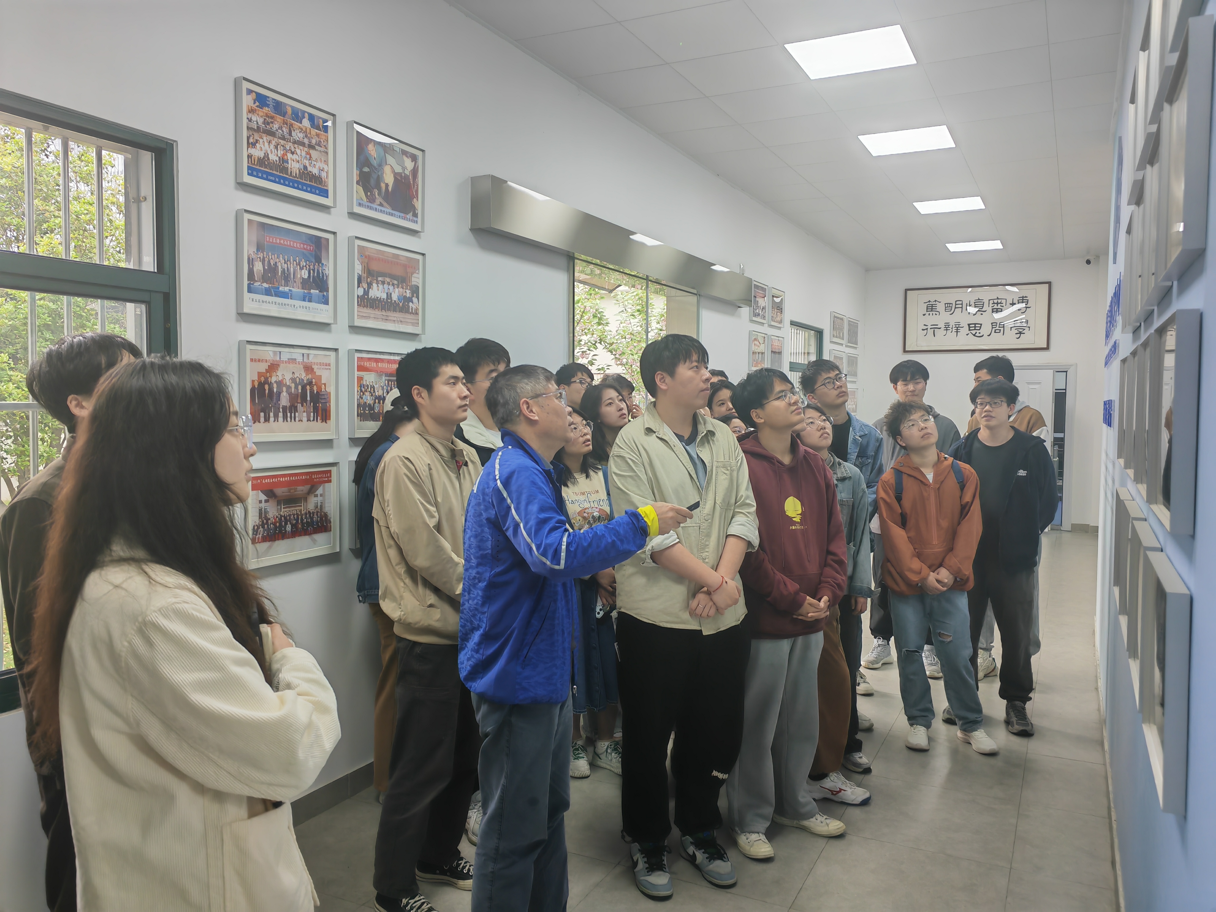 正值春日,桃李园内万物复苏,生机盎然。胡鹏浩教授首先向同学们介绍了桃李园的由来。桃李园原是一片实验室前乱石成堆杂草丛生的荒地,后由费业泰教授弟子毕业时手植花木感谢师恩,现已成为校园师生共育的一道亮丽风景——“桃李园”。随后,大家进入“费业泰精密工程中心”,胡鹏浩教授讲述了文化墙上每张照片背后的故事,回忆了在求学和从教生涯中恩师费业泰教授对每一位员工的悉心教导,始终要求他们做到“勤奋、求实、谦让”,言传身教培育员工形成“精益求精,追求卓越”的治学态度。同时结合专业课程学习,胡鹏浩教授介绍了费业泰教授提出的精度误差理论已成为我国精度评定的基本方法以及精密仪器学科的理论基础,由他编写的《误差理论与数据处理》是我国精密仪器学科的开拓之作。最后,全体同学集中观看了《费业泰精益求精的科研人生》视频。
