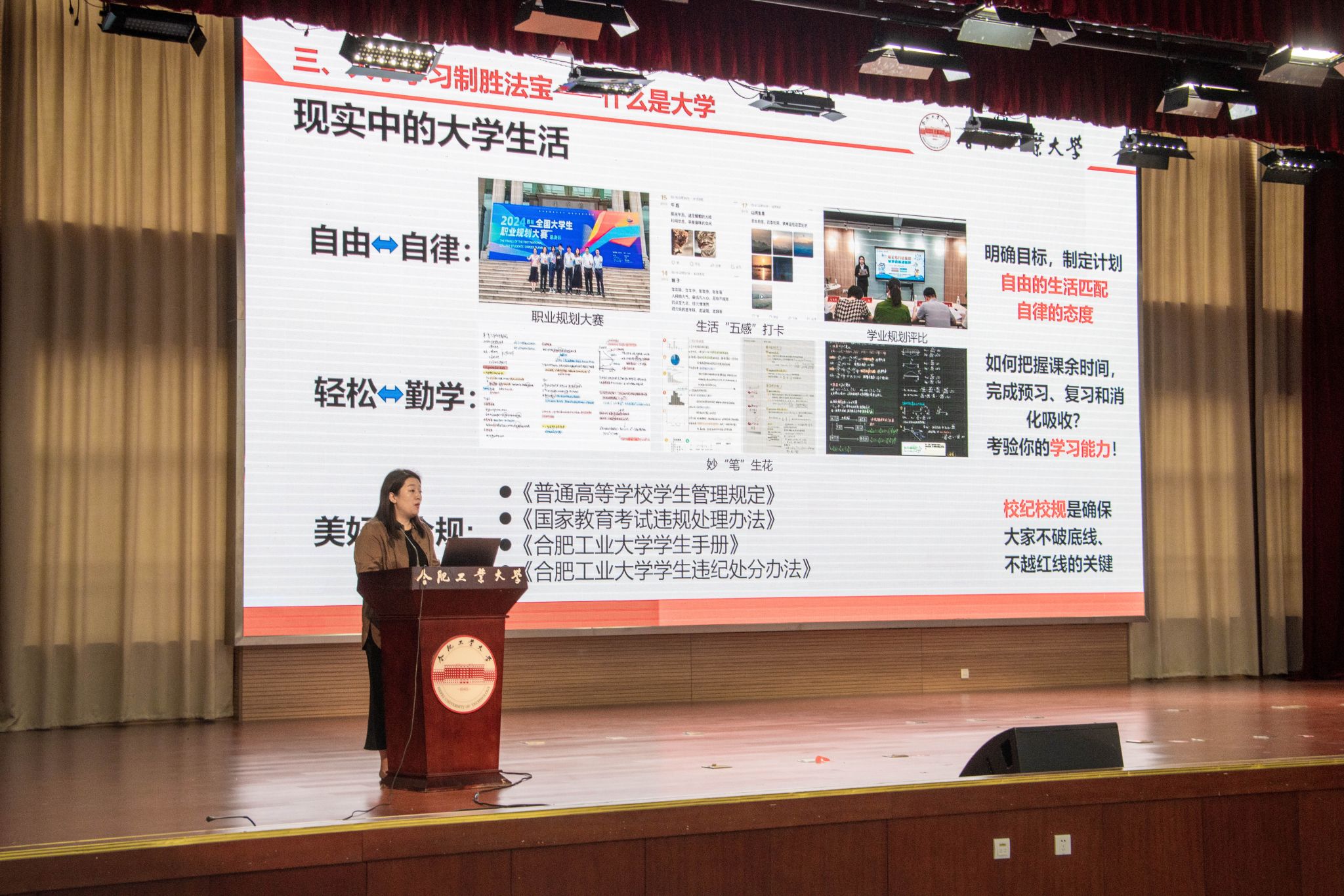 刘开阳围绕“我的大学初印象”“第一第二课堂两手抓”“大学学习制胜法宝”“人际关系:构建我的快乐星球”“打造个人生涯IP”五个方面展开。她通过生动案例与宣传视频,详尽介绍了合肥城市风貌、学校发展成就及丰富多彩的校园生活,并重点解答了“何为大学教育”“应学何物”及“如何高效学习”等关键问题。她还就人际关系处理与生涯规划给予了专业指导,鼓励新生在追求学业精进的同时,注重人际网络的搭建与综合素质的提升。